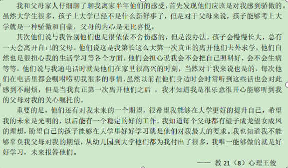 一学期结束,大部分大一新生都经历离家千里求学,再到从新踏进家门的过程,这时“生活的烦恼可以和妈妈说说,学习的事情可以和爸爸谈谈”。同学们在与父母进行交流的过程中,各种感想化作一行行文字,有同学写到“在经历了那次刻骨铭心的谈话后,我们(自己和父母)也越来越能理解对方。对于我来说,家永远都是我温暖的港湾,家人之间永远都是双向奔赴的爱。”也有同学提到妈妈的话“女儿,你是妈妈的孩子,这种血缘关系是前世修来的,是上帝赐予的,妈妈非常珍爱,妈妈想做你坚实的后盾,更想做你的朋友,最亲密最要好的朋友。妈妈知道你是一个懂事,乖巧,善解人意的孩子,妈妈相信,我的女儿会越来越成熟,越来越懂事,你是妈妈的骄傲,妈妈真的为你自豪。”很多同学由谈话想到了自己的成长经历,想到了父母的付出,在同学们的字里行间,我们觉得当初设计这一活动的目标达成了。