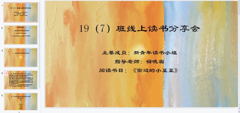 当前活动仍在进行中,各读书小组已逐步进行线上阅读与分享,在知识海洋中遨游。其中,小教197班的同学已经完成了小组PPT的制作与第一次读书会议的开展。相信在同学们的积极思考与感悟下,会有不一样的收获与见解。同时也期待大家下一阶段提交的读书笔记与读书心得。