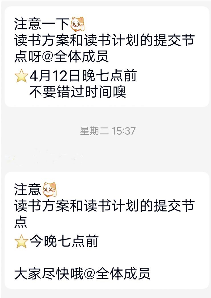 截至4月12日,收取报名小组成员名单及读书方案与读书计划的任务已完成。活动前期,工作人员认真负责,撰写策划与通知,建立相关活动群以便沟通。在通知下达后,各班宣传委员及时进群,询问相关问题,对活动认真负责。活动报名期间,同学们踊跃参与。临近截止时间,工作人员及时提醒,以防同学漏报忘报。材料收集完毕后,工作人员即刻整理汇总各班提交的材料,做好核对工作,推进活动进度。