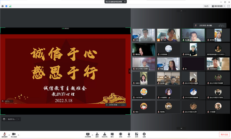首先薛颖老师召集生活委员进行线上会议,讲解了活动内容。随后并在生活委员群中发布了活动通知和申报表。19、20、21三个年级各个班级积极参与,以线上线下不同形式展开活动,有的班级邀请了班主任参与班会,也有的班级为班主任主讲,向同学们传达了“诚信感恩,励志笃行”的主题。最后经过评选,选出了196、209、218三个优秀班级上报公司进行评比。