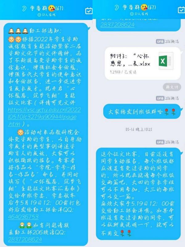首先在学委群中发布相关活动通知及汇总表,请学委转发至各班班级群,呼吁同学们积极报名。随后于516日再次通知,提醒同学们报名截止时间。最终有近四十名同学参与活动并提交文章,随后建立评委群,评选出了十位优秀的同学,将所有员工文章和优秀作品打包发给老师看了之后,交至公司进行最终评比。