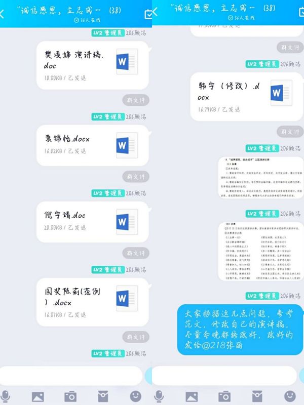 首先在学委群发布活动通知,让同学们自主报名,并建立活动群。接着让同学们先将演讲稿初稿发给负责人,给老师看了以后,将稿子出现的问题及范文发到群中,让同学们修改演讲稿。随后将修改后的稿子进行挑选,评选出部分优秀的同学,并发给老师看。然后确认没有问题后,通知优秀的同学进行视频的拍摄。最终将优秀同学的演讲视频发送至公司参加复赛。