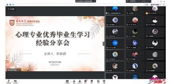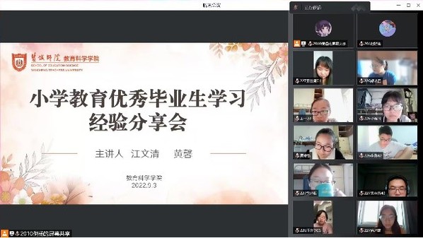 2022年9月3日上午,郑杨学长作为学前教育优秀毕业生代表,在腾讯会议为全体学前教育新生举行了经验分享会。会议主要向2022级同学分享关于大学四年在校期间的学习生活规划、多彩的校园生活以及学前教育未来的方向选择等内容。