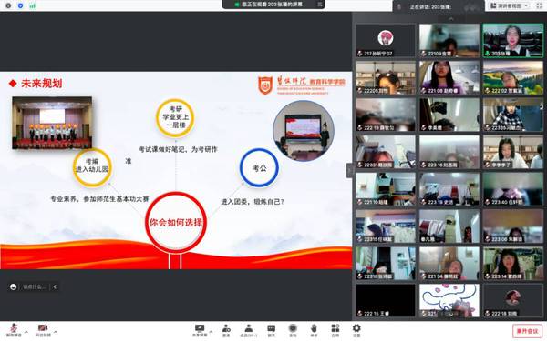 2022年9月9日晚,伟德BV1946官网学前教育专业邀请吴晶晶、张璠、张彤三位学姐作为优秀员工代表,在腾讯会议为全体学前教育新生举行了“学前教育新老生交流会”。会议主要由三位学姐结合自己的老员工活,通过自己的反思总结,为新同学们开启老员工活提供了宝贵的经验。