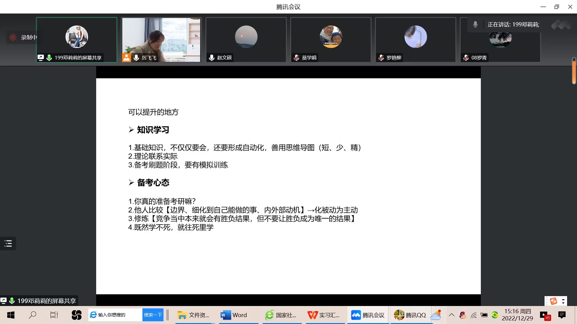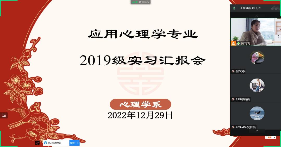 20221229下午心理学系在腾讯会议举行应用心理学专业2019毕业生实习成果汇报会,厉飞飞主持本次活动心理学系全体员工参与本次汇报实习汇报既是对员工实习成效的检验,也是提升应用心理学专业员工专业技能的重要环节。