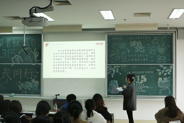 本次活动主题为“消费者权益保护,你我同行”。活动伊始,在简述活动目的、国际消费者权益日的成立宗旨和发展历史后,主持人万梦玲和同学们分享了拒绝退换商品、结账反向抹零等相关案例,并科普了消费者权益的基本定义。
