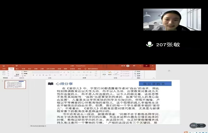 随后,20(7)小教X的张敏同学,为大家分享了《爱弥儿》的阅读心得,她表示读《爱弥儿》最大的收获是:遵循自然的要求,顺应人的天性是教育的重要法则之一。教师的职责在于引导员工直接感知外部环境,避开无知、荒谬的东西,获得有用的知识与技能,而不是压制儿童的个性,束缚儿童的自由,强迫服从,强制灌输。