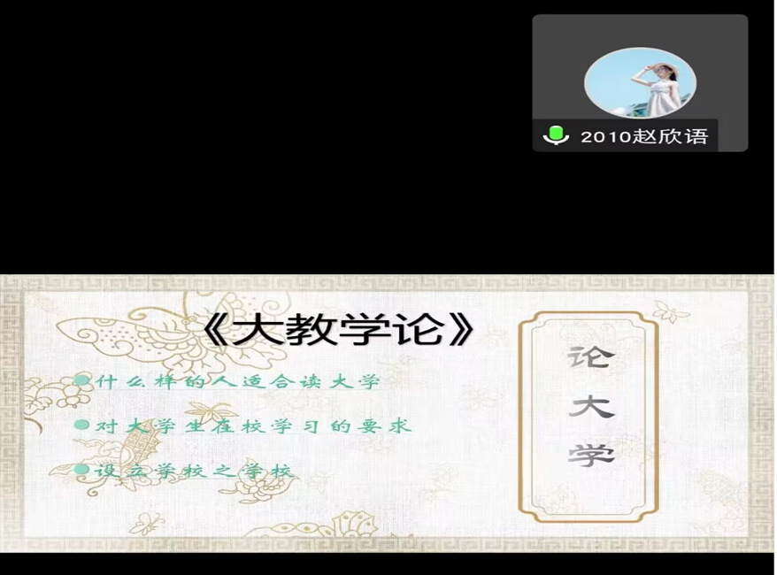 活动伊始,20(10)小教S班的赵欣语同学,向大家分享了阅读《大教学论》的所思所想,她认为《大教学论》中“把一切事物教给一切人的艺术”是超越时代的先进教育思想,“一切事物”体现了夸美纽斯的泛智主义教育主张,“一切人”则体现了教育公平的思想。