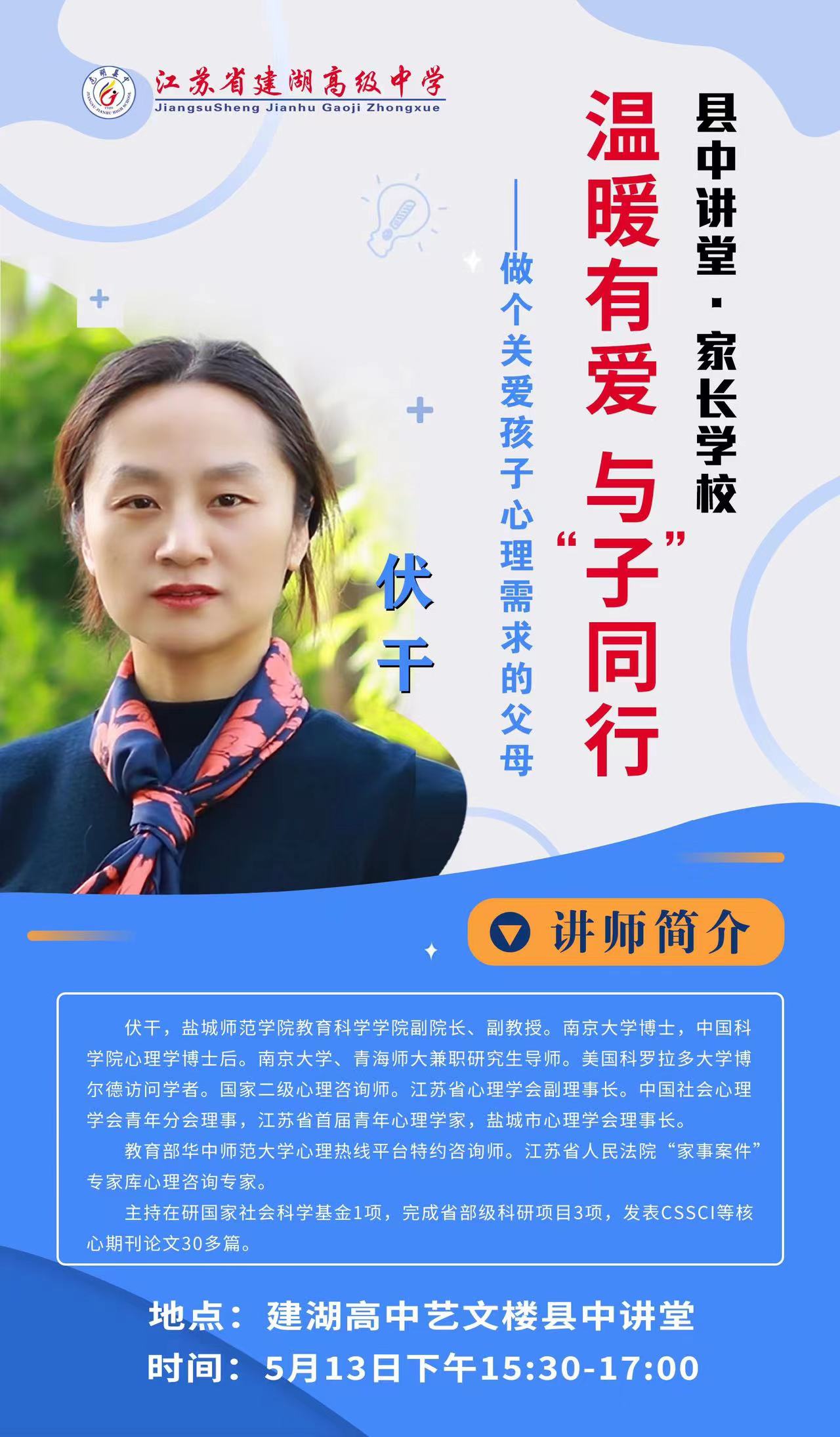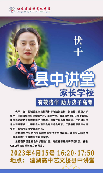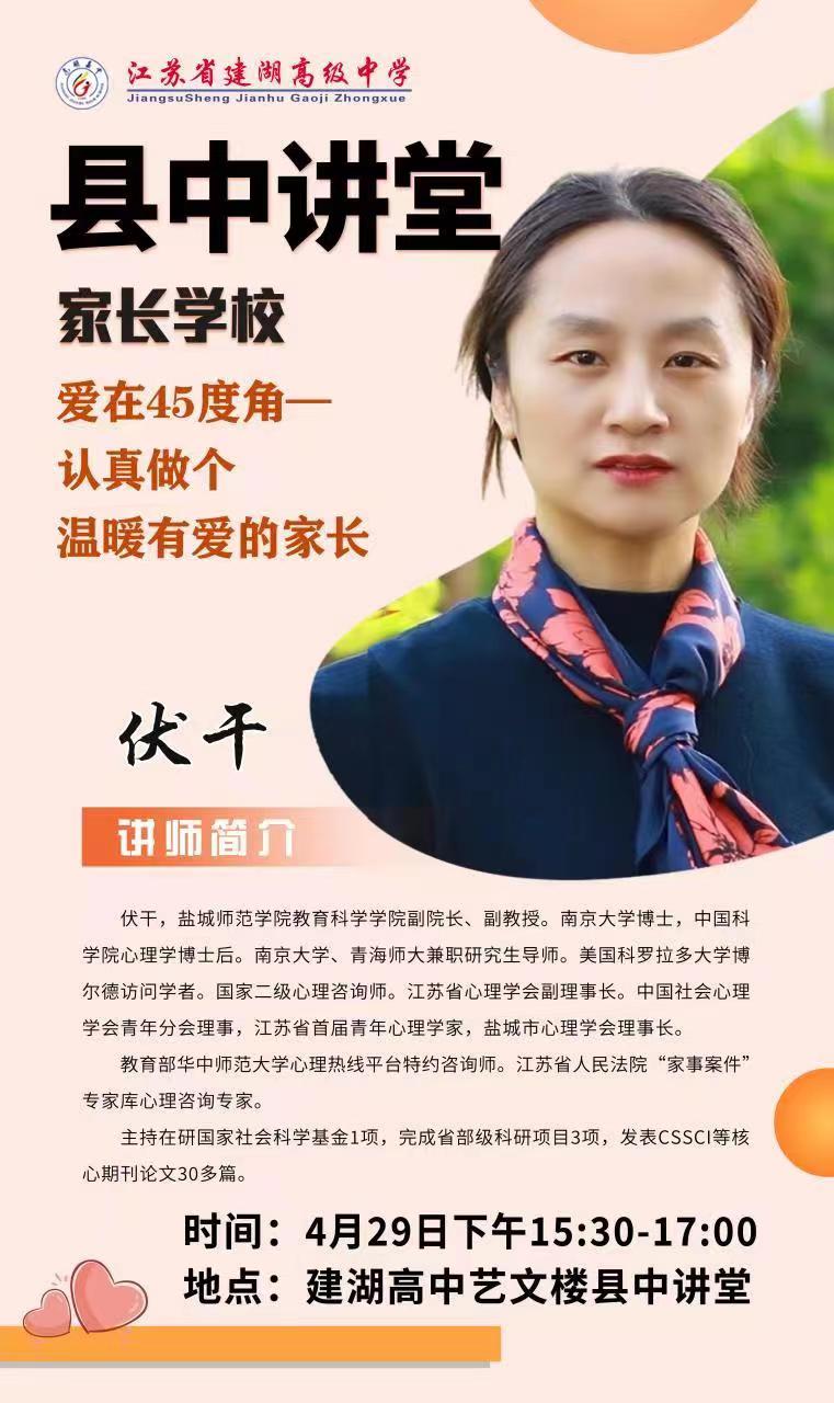 4月15日至5月13日,盐城市心理学会理事长、伟德BV1946官网副经理伏干博士受邀为建湖高级中学“县中讲堂 家长公司”开展家庭教育讲座。此次讲座为建湖高级中学的家长和员工带来了新的教育思维,为推动家校共育注入新的动能。