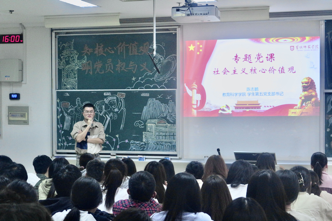 陈志鹏深入浅出地讲解了社会主义核心价值观的发展历程与概念内涵,强调社会主义核心价值观凝聚了全党、全社会的价值共识,代表了当代中国人的共同价值追求,新时代青年要提高党性修养,自觉把思想和行动统一到社会主义核心价值观上,做社会主义核心价值观的积极践行者。