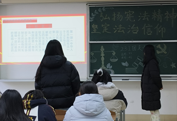 活动伊始,各团支部组织观看宪法宣传,人民的宪法等视频,该视频强调了宪法的意义和价值,同学们深入学习“坚持社会主义本质特征、民族团结和国家统一、改革开放、实事求是,从实际出发”的宪法精神,在新时代新征程上推动宪法全面实施,不断发展全过程人民民主。随后,各团支部围绕“国家宪法日的设立”、“宪法的发展历程”、“宪法的基本精神和特征”、“弘扬宪法精神,坚定法治信仰”四个内容展开详细讲解。经过学习,同学们纷纷表示在以后的生活中会树立正确的人生观和价值观,以习近平法治思想为指导,大力弘扬宪法精神和社会主义法治精神,运用法治手段解决道德领域突出问题,维护社会主流价值。最后,各团支书积极结合员工自身的实际情况,充分考虑青年员工的多元化需求和特点,勇于尝试并开展互动式、参与式、讨论式的主题团日活动,针对宪法进一步的认识与感悟进行交流。团课结束后,同学们领悟到,作为当代青年应当深入学习贯彻习近平法治思想,坚定不移地走中国特色社会主义法治道路,让宪法精神在青年员工心中落地生根,谱写新时代中国特色社会主义更加绚丽的华章。