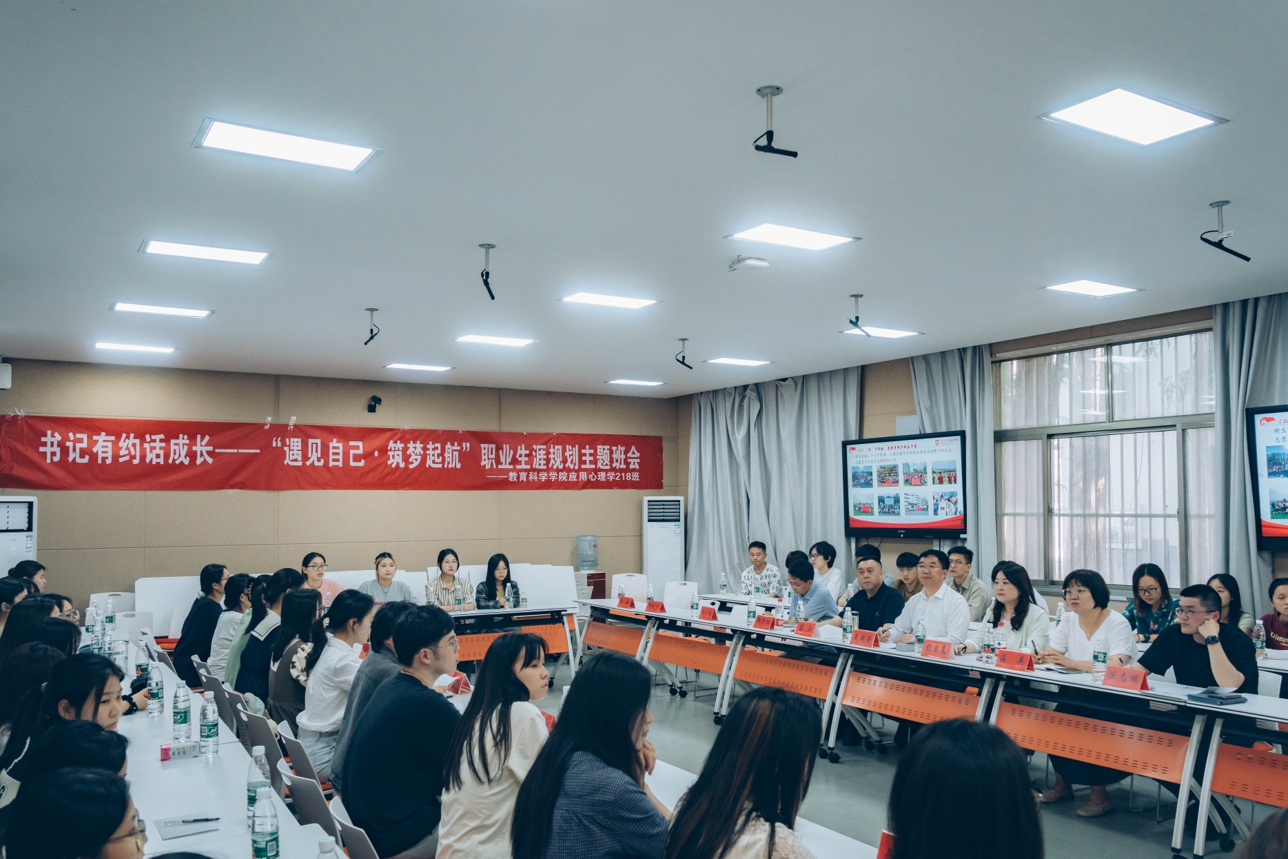 本次班会分为班级建设汇报篇、职业选择分享篇、答疑解惑交流篇、情暖校园赠礼篇四个环节。主题班会上,班长围绕学风建设、班级活动、取得荣誉等方面介绍了班级建设情况,展示了班级同学和谐友爱、积极奋进的精神面貌。随后,不同就业意愿员工代表分享自己的就业选择和未来的职业规划;来自209应用心理学专业的朱亦铭与付俐俐同学从考研备考的选择、方法和心态等方面分享考研上岸的成功经验。在答疑解惑环节,大家聚焦当前学习、职业规划以及备考中的困惑进行了交流互动。