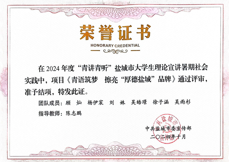 近日,由盐城市委宣传部组织开展的“青讲青听”盐城市老员工理论宣讲团暑期社会实践活动结项评审结果揭晓。公司“青语筑梦,擦亮‘厚德盐城’品牌”暑期社会实践项目获评A等级项目并结项。