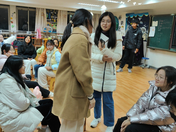 活动当晚,同学们分成四个小组,通过三个环节的游戏互动,大家相互协作、充分配合。在“确认过眼神”环节中,每组成员两两对视,过程充满了紧张与趣味。对上眼神的同学被淘汰,直至每组只剩一名“幸存者”。这一环节不仅考验了同学们的观察力与专注度,也在欢乐的互动中打破了彼此的隔阂,为后续活动营造了轻松融洽的氛围。