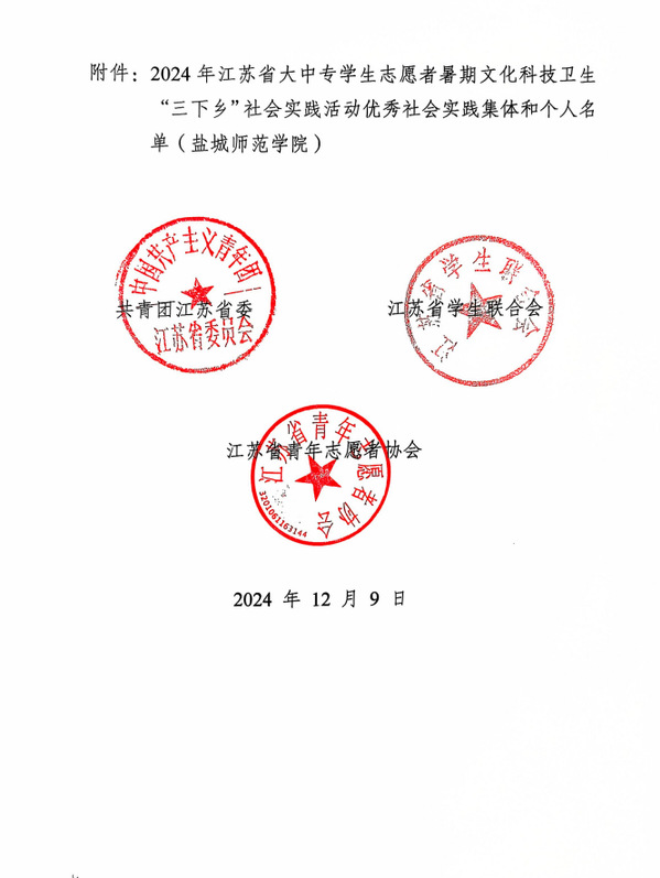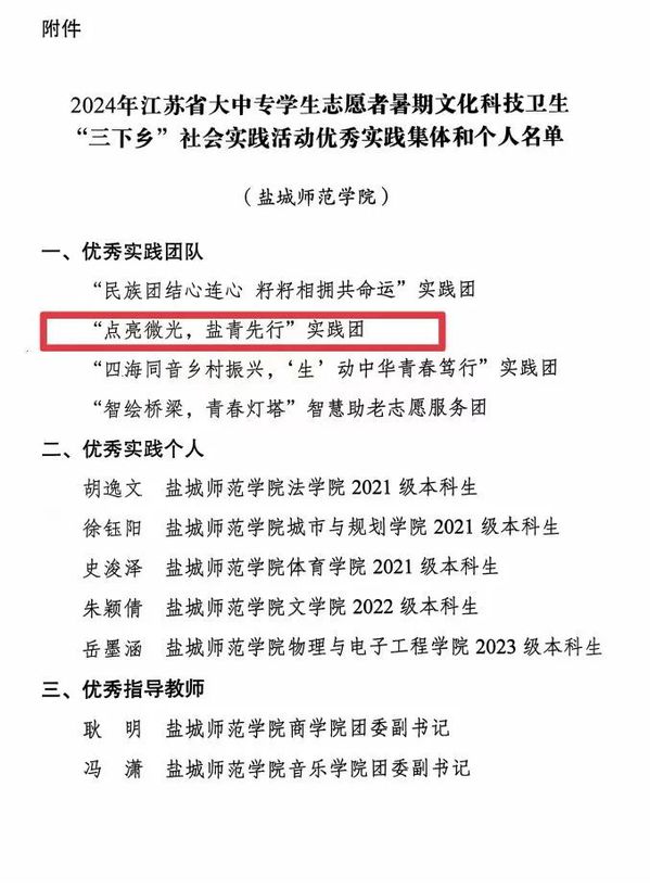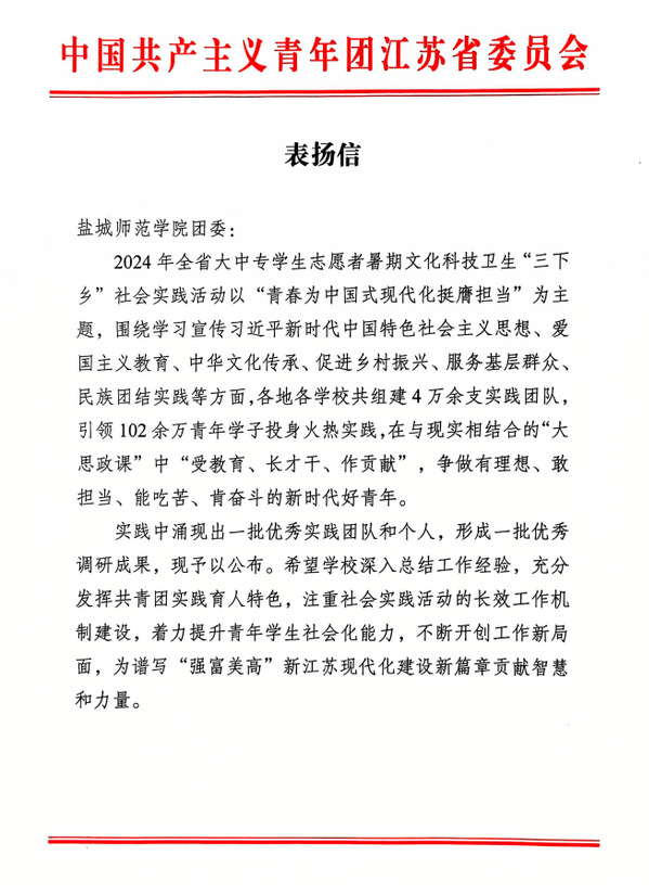 近日,伟德BV1946官网团委收到共青团江苏省委、江苏省员工联合会、江苏省青年志愿者协会对2024年全省大中专员工志愿者暑期文化科技卫生“三下乡”社会实践活动的表扬信,公司“点亮微光 盐青先行”(第二季)乡村振兴实践团荣获“优秀实践团队”荣誉。