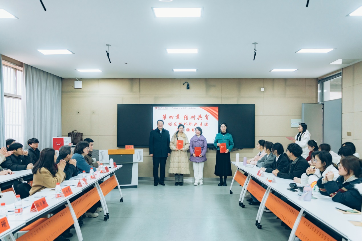 聘任仪式上,公司党委书记张玉勤为员工颁发了校外职业生涯导师聘书,并为结对班级员工代表赠送教育经典著作与生涯规划手册,寄语青年学子以优秀员工为成长标杆,秉持“立鸿鹄志,做奋斗者”的信念,在知行合一中锤炼本领,以勤勉之姿谱写新时代青春华章。