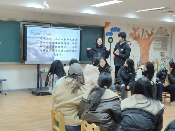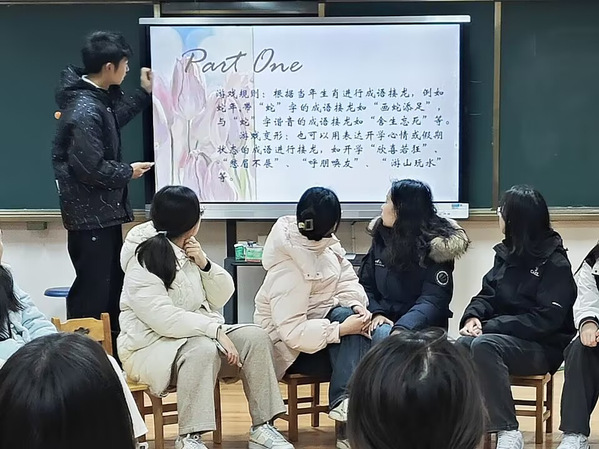 活动现场,各类趣味游戏精彩纷呈。在“生肖成语”接龙游戏环节,同学们围绕“上课状态”展开创意接龙,“郁郁寡欢”“心浮气躁”“愁眉不展”等成语生动刻画学业压力下的情绪,而“聚精会神”“思如泉涌”则展现了专注与灵感迸发的积极状态;随后切换至“春游主题”,现场氛围瞬间活跃,“喜笑颜开”“风景如画”“鸟语花香”“万紫千红”等词汇接连迸发,描绘出一幅幅生动的春游图景。