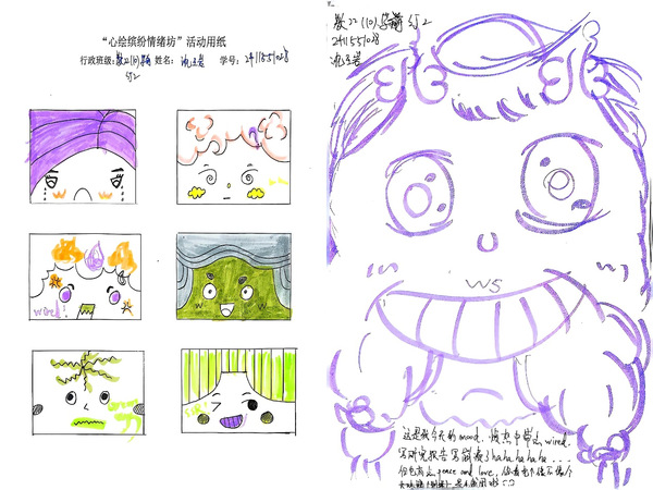 活动在主持人的热情介绍中拉开序幕。参与者以6人小组为单位,在25分钟的自由创作时间里,用画笔将喜怒哀惧等情绪转化为具象的表情符号。明黄与橙红交织出雀跃的笑脸,蓝紫色漩涡描摹愤怒的漩涡,更有同学突破平面限制,用立体折纸展现情绪的层次变化。“绘画时仿佛在和自己的潜意识对话。”2022级沈同学在绘制的毛线球旁写下这样的感悟,“原来情感也可以如此古灵精怪,写研究报告时的愤怒中夹杂着‘Wired’,却也藏着‘Peace and love’。”