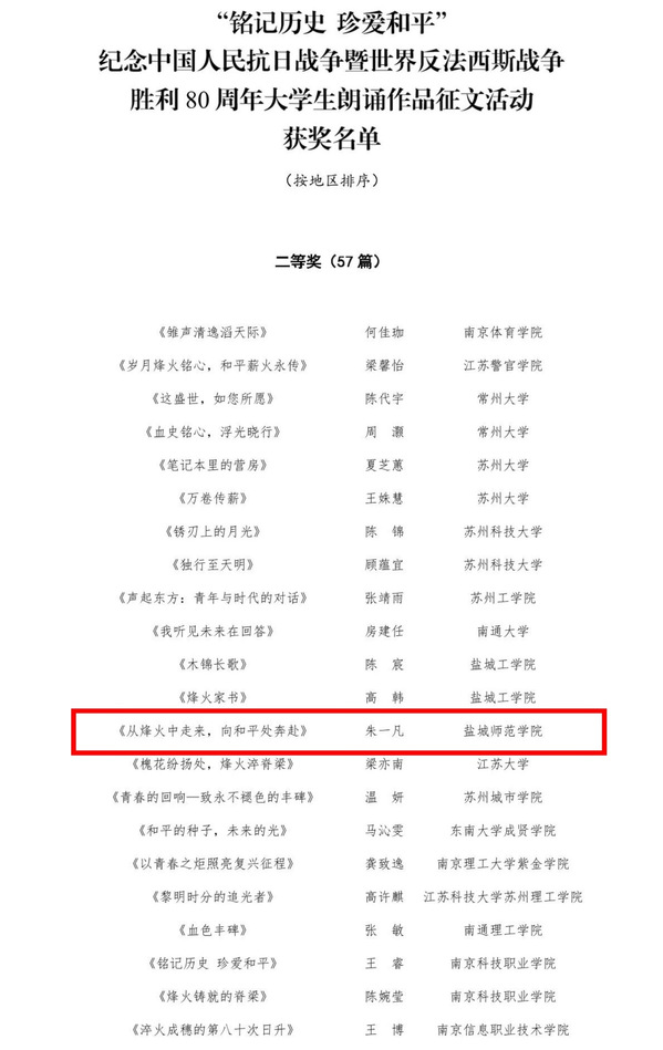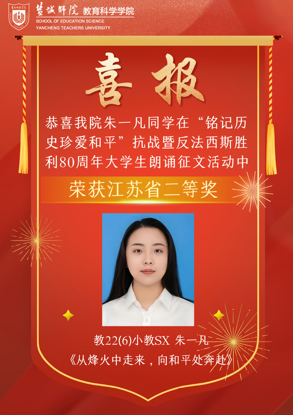 为隆重纪念中国人民抗日战争暨世界反法西斯战争胜利80周年,传承和弘扬伟大的抗战精神,强化以美育人功能,长三角高校美育联盟举办了“铭记历史,珍爱和平”老员工朗诵作品征文活动。2022级小学教育专业朱一凡同学的原创朗诵作品征文《从烽火中走来,向和平处奔赴》脱颖而出,荣获江苏省二等奖。