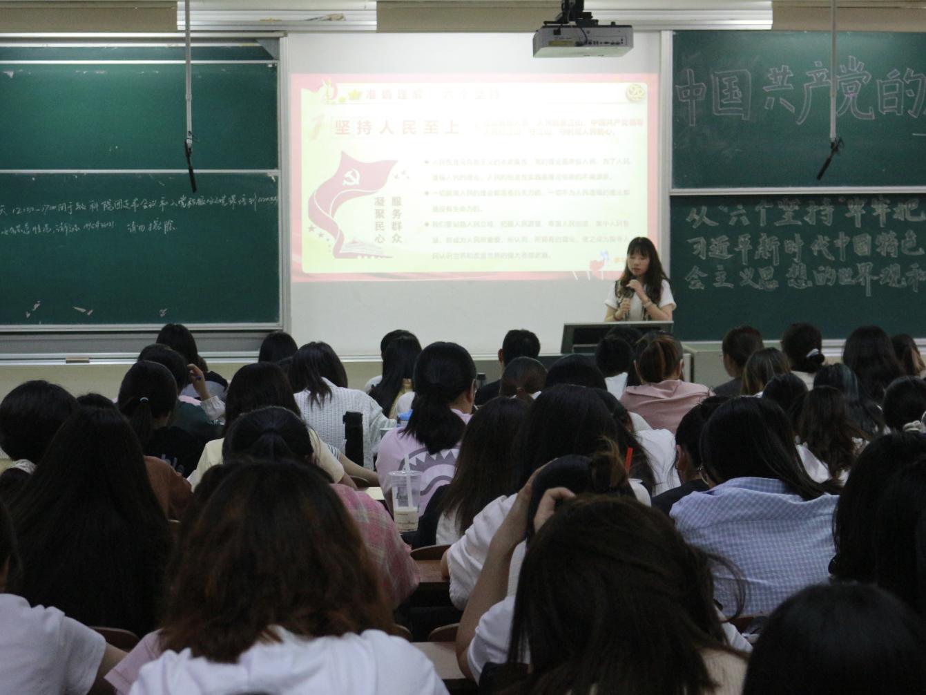 本次党课主题为《从“六个坚持”牢牢把握习近平新时代中国特色社会主义思想的世界观和方法论》。潘虹围绕必须坚持人民至上、必须坚持自信自立、必须坚持守正创新、必须坚持问题导向、必须坚持系统观念和必须坚持胸怀天下六个方面为大家展开阐述。她强调,作为习近平新时代中国特色社会主义思想的精髓,“六个坚持”不仅是推进马克思主义中国化时代化的根本遵循,也是习近平新时代中国特色社会主义思想的世界观和方法论,还是用于指导新时代中国特色社会主义事业的基本立场观点方法,充分彰显了习近平新时代中国特色社会主义思想的原创性贡献。潘虹表示,作为入党积极分子,要系统掌握习近平新时代中国特色社会主义思想的基本观点、科学体系,把握好这一思想的世界观、方法论,坚持好、运用好贯穿其中的立场观点方法,把习近平新时代中国特色社会主义思想转化为坚定理想、锤炼党性和指导学习生活工作的强大力量。