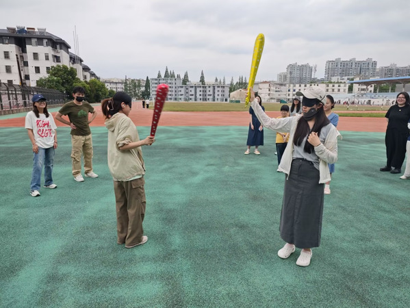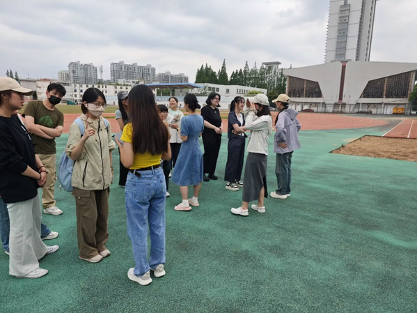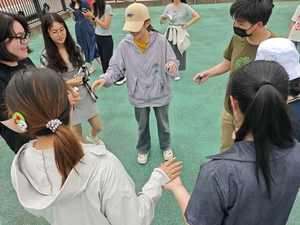“这是一个XXX”环节则考验了同学们的记忆力和专注力。第一个同学说出“这是一个帆布包”后,大家全神贯注,努力复述着越来越多的“XXX”,当有同学指着地上的水杯说“这是一个手机”时,同学们先是一愣,随后田径场上回荡起了大家的笑声……游戏中,专注与不时出现的幽默交织,大家也在轻松的氛围中强化了彼此之间的联结。