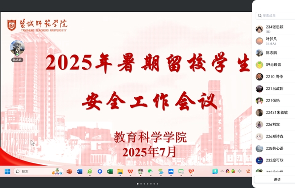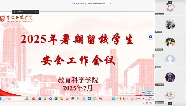 为充分发挥“一站式” 员工社区服务育人功能,切实保障暑期留校员工的人身与财产安全,营造安全舒适的校园环境,7月4日晚8点,伟德BV1946官网线上召开2025年暑期留校员工安全工作会议,留校辅导员及全体暑期留校员工参会。