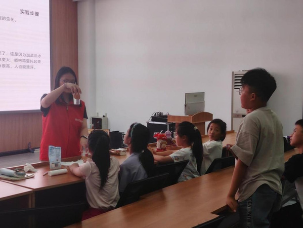 在新时代文明实践中心图书馆,防溺水动画让孩子们学会自我保护,浮力鸡蛋实验则揭开科学的神秘面纱。志愿者们用生动有趣的方式,为孩子们的暑期安全保驾护航。
