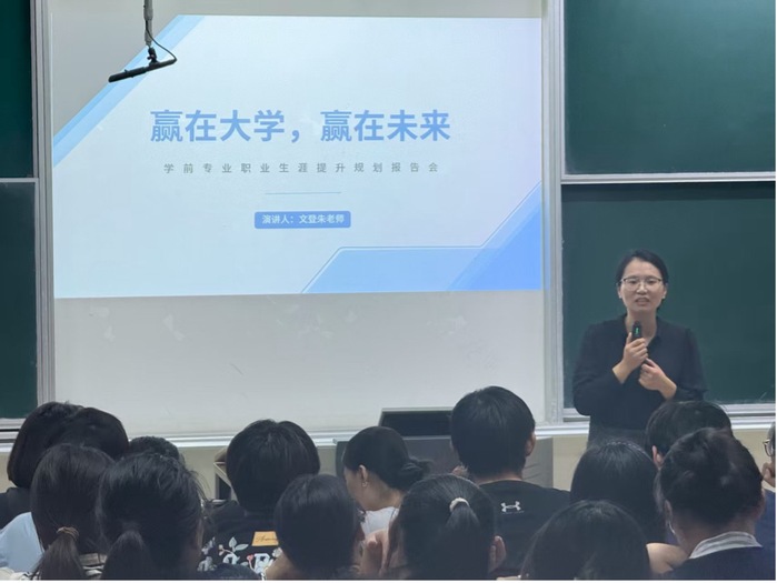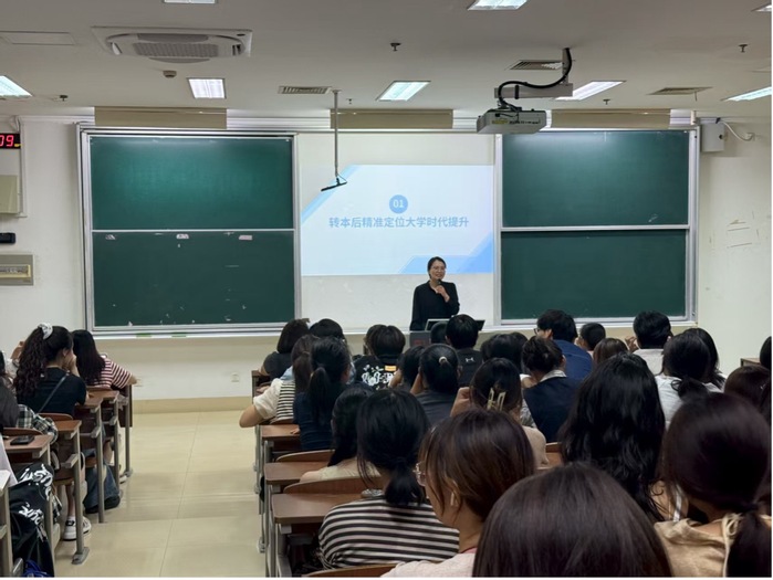 随后,朱老师以“赢在大学,赢在未来”为主题展开讲座。她结合转本新生的学习与发展特点,深入剖析了大学阶段在职业生涯规划中的关键意义。结合当前社会需求与教育行业发展趋势,阐释了研究生阶段学习对于提升个人竞争力和拓展职业路径的重要价值。她结合教育行业的发展现状剖析了不同的发展路径,帮助同学们深刻认识到社会需求的多样性与明晰自我定位的重要性。