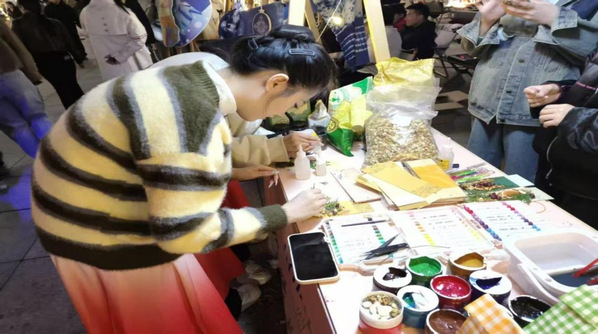 活动依托校园与盐城湿地公园的落叶资源,搭配环保染料与定制工具,打造“落叶盲盒”创意体验。参与者随机抽取叶片,在专业指导下完成植物拓印创作,并手写秋日寄语,将叶脉纹理转化为独一无二的艺术作品。通过沉浸式手作体验,参与者既感受到秋韵与工艺之美,也以“落叶再生+可降解材料”的巧思,践行了绿色环保理念,生动诠释青年群体的文化创新力。