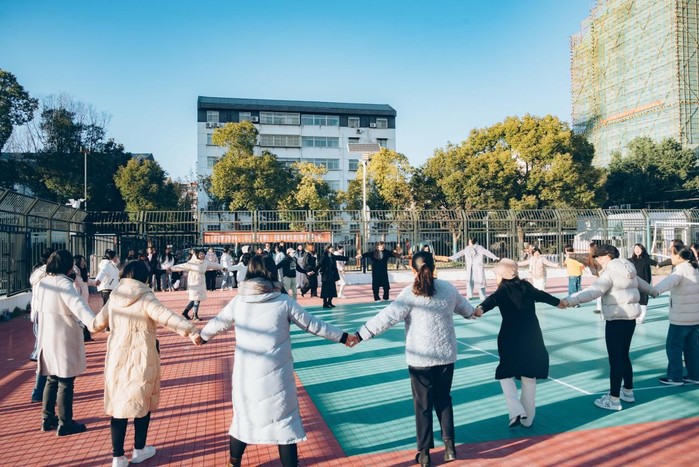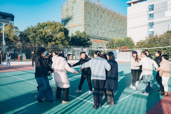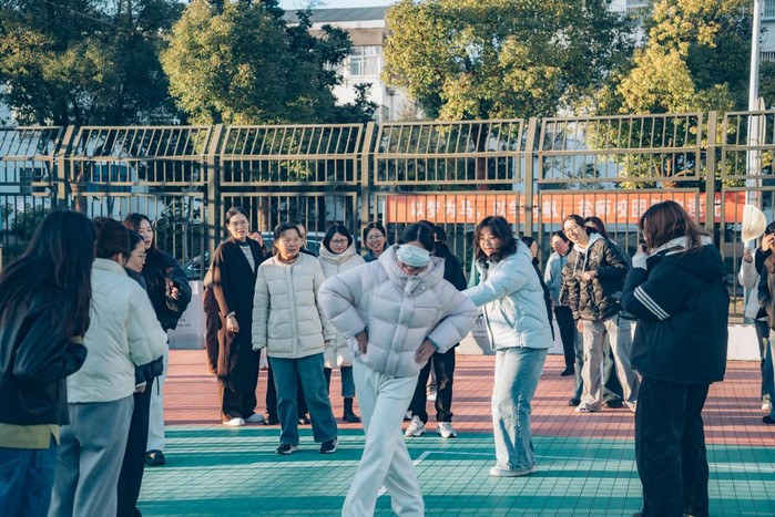 活动在“桃花朵朵开”热身环节中拉开帷幕。老师们在主持人报数中迅速抱成小团,现场笑声不断。随后的团队游戏“贪吃蛇”,各小组成员紧密相随,灵活调整步伐,充分展现了团队的默契与策略。舞蹈体验《夜上海》通过优雅的舞步让老师们在轻松的节奏中释放压力。