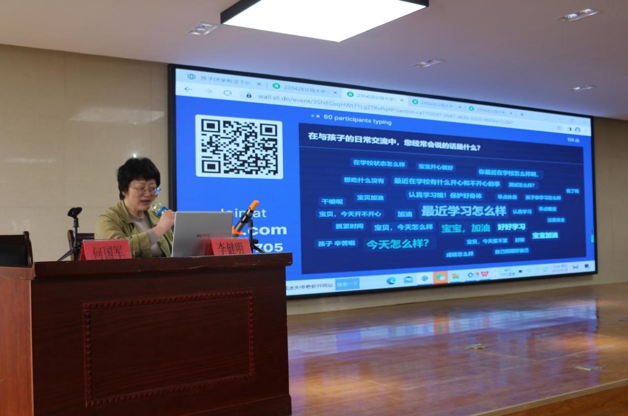 讲座初,李健明老师通过slido系统设置议题,现场收集全体高二员工家长对于“对孩子最想说的话”“作为家长应该如何与孩子进行良好沟通”等相关问题,家长反馈词条呈现实时动态化、可视化的词频统计图像,直观清晰的表现出家长与孩子的交流沟通现象。